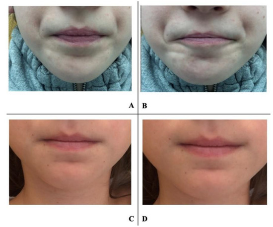 An 8-year-old patient. (A–B) before treatment; (C–D) after 6 months of treatment; (A) rest position, before treatment; (B) during swallowing, before treatment; (C) rest position, after treatment; (D) during swallowing, after treatment.