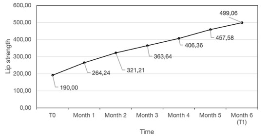 In addition to the successful treatment in 33 subjects out of 40, clinical analyses also showed a normalization of facial mimicry in 84.84% of the compliant patients (28 out of 33), while in five patients, despite the normalization of swallowing, a residual alteration of the facial mimicry was still visible at t1 (after 6 months), although considerably reduced compared with t0 and with improvement of the lip strength. In addition, all of the four compliant children with labial incompetence showed correction after treatment. No side effects were reported. None of the seven non-compliant children attributed their absence of compliance to problems caused by FM. With regard to maximum lip strength, a statistically significant mean increase of 257% was observed in compliant children (p < 0.0001) from t0 to t1, as represented in Table 1 and Figure 6.