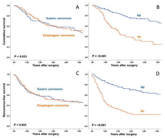 Survival in patients with esophagogastric adenocarcinoma after therapy with 5-FU, Leucovorin, Oxaliplatin and Docetaxel (FLOT) and surgical resection. Overall survival (A) and recurrence-free survival (B) of 131 patients with esophageal carcinoma and 97 patients with gastric carcinoma were similar. Nodal involvement (N+, n = 153) was the major predictor of overall survival (C) and recurrence-free survival (D).