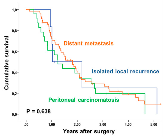 Multivariate analysis with inclusion of postoperative nodal status, tumor stage (ypT0-2 versus ypT3-4), administration of adjuvant treatment, histopathological regression, postoperative M-status, ASA-score and resection margin identified postoperative nodal status and T-stage as independent predictors of improved overall and recurrence-free survival Table 4. Administration of adjuvant chemotherapy was not significant for overall survival (p = 0.057) and recurrence-free survival and met the defined significance level only for the latter (RR: 1.52 (1.00–2.32) p = 0.050). The site of recurrence had no impact on overall survival time (p = 0.638; Figure 2).