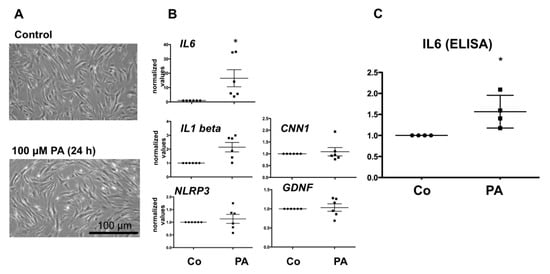 As shown in Figure 1A, the cellular morphology of HTPCs cultured with 100 µM PA for 24 h did not change compared to cells cultured in the presence of the solvent control. Under both conditions, cells were characterized by a slim, spindle-like shape. Using qPCR, we found that PA at 100 µM significantly (p < 0.05) increased mRNA levels of IL6, while NLRP3 and IL1beta were not significantly affected (p > 0.05) (Figure 1B). The levels of the contractility marker CNN1 and the growth factor GDNF were likewise not changed.