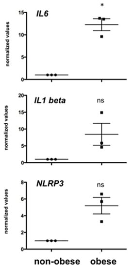 Levels of testicular Interkeulin 6 (IL6) were significantly elevated in testes of obese monkeys, while higher levels of Interleukin 1 beta (IL1beta) or the inflammasome NLRP3 did not reach statistical significance; n = 3, * p < 0.05; ns: not statistically significant. The data of the obese animals (n = 3) are given as individual levels and as the mean ± SEM. The values were normalized to the levels of the controls group (pooled results of n = 6 non-obese monkeys).