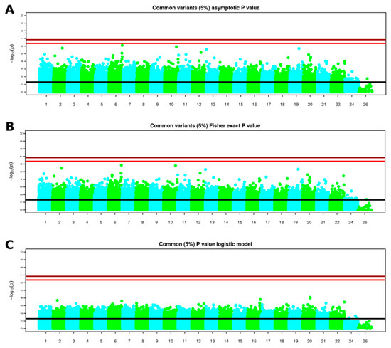 Manhattan plots indicating the negative base 10 logarithm of the p-values obtained performing: basic allele chi-square test (A) and Fisher’s exact test (B) and logistic regression model (C) on 341,946 common variants obtained from whole genome genotyping data. The black horizontal line represents a significance level of 0.05. The light red horizontal line represents the multiple testing obtained considering the number of independent loci; the dark red horizontal line represents the multiple testing threshold obtained considering the total number of considered common variants. Chromosomes over 22 represent sexual and mitochondrial chromosomes.
