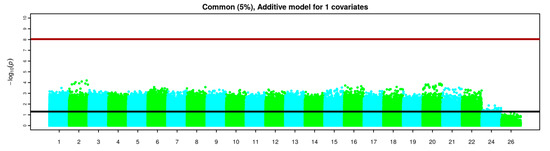 Manhattan plot indicating the negative base 10 logarithm of the p-values obtained when including each single covariate into the logistic regression model for 341,946 common variants from whole genome genotyping data. For each individual variant, a single test for each covariate was performed, so for each variant, 16 different tests were performed and each test is represented by a point in the Manhattan plot. The black horizontal line represents a significance level of 0.05. The dark red horizontal line represents the multiple testing threshold obtained considering the total number of performed tests (Number of variants × Number of covariates). Chromosomes over 22 represent sexual and mitochondrial chromosomes.