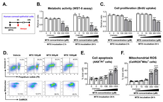 In parallel with the clinical study, we examined whether MTX might exert direct toxicity in human CECs (Figure 2A). The measurement of metabolic activity showed that MTX suppressed the viability of CECs in time- and concentration-dependent manners (Figure 2B). The cell viability was reduced to 66.7% relative to vehicle-treated controls after 2 h of 300 μM MTX treatment and further decreased to 45.2% after 24 h. The reduction of cell viability was more marked with 1000 μM MTX; the viability was 32.3% and 19.4% after 2 h and 24 h of 1000 μM MTX treatment, respectively, compared to vehicle treatment. A similar observation was made with cell proliferation. The BrdU uptake assay indicated that MTX inhibited the proliferation of CECs in a concentration-dependent manner with 300 μM and 1000 μM MTX exhibiting significant inhibitory effects (Figure 2C). In addition, MTX induced the apoptosis of CECs. The frequency of ANX+PI+ cells, indicative of apoptotic cells, was significantly higher in CECs treated with 300 μM and 1000 μM MTX (48.1 ± 7.1% and 58.9 ± 4.6%) than in vehicle-treated cells (20.4 ± 4.4%) as assessed by flow cytometry (Figure 2D,E). Similarly, the frequency of CellROX+MT+ cells, reflecting mitochondrial ROS generation, was significantly higher in 300 μM and 1000 μM MTX-treated CECs (31.6 ± 4.5% and 41.5 ± 6.1%), compared with the vehicle-treated control (16.7 ± 3.2%) (Figure 2D,F).