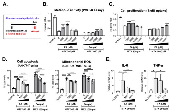 Protective effects of folinic acid on methotrexate-induced toxicity in corneal epithelial cells. (A) Experimental scheme. Primary cultures of human corneal epithelial cells were treated with 300 μM or 1000 μM methotrexate (MTX) in the absence or presence of various concentrations of folinic acid (FA) and assayed 24 h later. (B) WST-8 assay for measurement of cell metabolic activity. (C) BrdU uptake assay for assessment of cell proliferation. (D) Quantitative flow cytometry results for cell apoptosis and mitochondrial reactive oxygen species (ROS) production. (E) Real-time RT-PCR analysis for IL-6 and TNF-α in human corneal epithelial cells. Shown are data scaled to MTX- and FA-untreated cells. Data are presented as mean ± SD and from 3 independent sets of experiments (n = 3 per group per set). A dot depicts data from one biological sample. * p < 0.05, ** p < 0.01, **** p < 0.0001 by one-way ANOVA and Tukey’s multiple-comparison test.