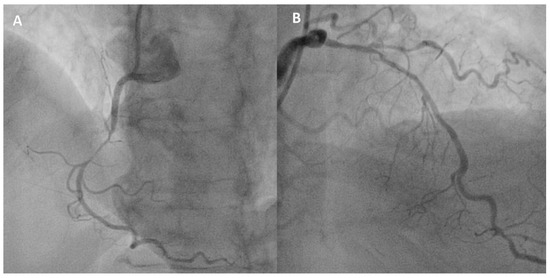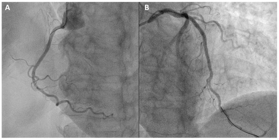 Coronary angiography in the patient case described in the case vignette. (A) The right coronary artery shows a tight stenosis in the mid segment (culprit lesion). (B) The left anterior descending coronary artery shows a long 75% maximum diameter stenosis in the proximal and mid segments.