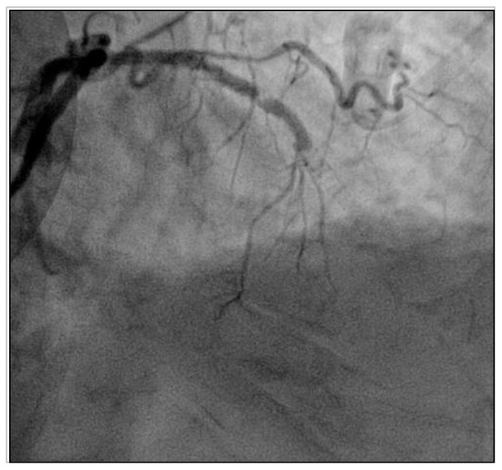 Two weeks after the hospital discharge, the patient was readmitted to the emergency department, this time with an anterior ST-segment elevation myocardial infarction. Coronary angiography showed a subacute stent thrombosis of the left anterior descending coronary artery (Figure 3), which was effectively treated with mechanical thrombus aspiration and balloon dilatation.