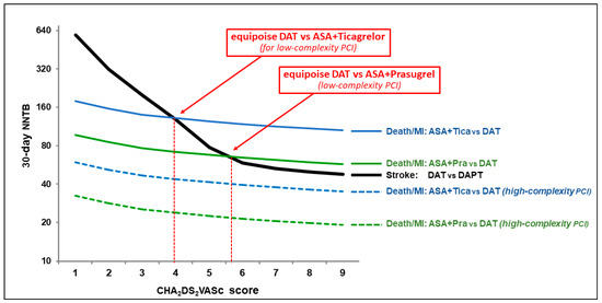 If a strategy of triple therapy is chosen in patients with concomitant AF and ACS, current guidelines strongly recommend against the use of the new P2Y12 inhibitors, the current standard of care after an ACS without AF. Ticagrelor and prasugrel have been clearly demonstrated to reduce the rate of cardiovascular events (cardiovascular death, reinfarction, and stroke) when compared to clopidogrel in the PLATO and TRITON-TIMI 38 trials, with a risk reduction within the first month of treatment ranging from 12% (ticagrelor) [8] to 22% (prasugrel) [9]. Since the incidence of cardiovascular events after ACS is also related, as is the embolic risk, to the CHA2DS2VASc score [23,24], we can expect a 30-day NNTB for cardiovascular events ranging from 179 (CHA2DS2VASc = 1) to 105 (CHA2DS2VASc = 9) with the use of ticagrelor instead of clopidogrel and from 97 (CHA2DS2VASc = 1) to 57 (CHA2DS2VASc = 9) with the use of prasugrel instead of clopidogrel (Figure 4; see Online Appendix of [15] for calculations). The calculated equipoise between NNTBs for stroke versus coronary events is at CHA2DS2VASc = 4 for DAPT with ticagrelor instead of DAT and at CHA2DS2VASc = 5 for DAPT with prasugrel instead of DAT (Figure 4). In patients with high-risk target lesions [16,25,26], the rate of early cardiovascular events, including stent thrombosis, is further increased and, accordingly, the above mentioned NNTBs deriving from the use of the new P2Y12 inhibitors instead of clopidogrel (the recommended P2Y12 inhibitor in case of TAT) are expected to be even lower. A 3.4 HR for early stent thrombosis is expected to occur in clopidogrel-treated ACS patients with ≥ 3 compared to one high-risk procedural feature among the following: long, bifurcated, eccentric, thrombotic, tortuous, angulated or calcified lesions, left main and multiple vessel PCI [16]. As a consequence, a 70% further reduction in the above-mentioned NNTBs has to be expected in case of high-complexity PCIs when modern DAPT with ticagrelor or prasugrel is used instead of DAT (Figure 4).