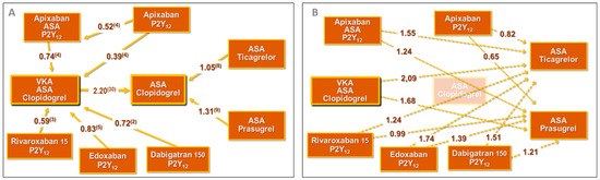 Since any direct comparison between combination therapies (various non-vitamin K antagonist oral anticoagulants (NOACs) against warfarin on top of single or dual antiplatelet regimen) and current state-of-the-art DAPT (aspirin plus ticagrelor/prasugrel) is not available, we cannot currently decide which of these antithrombotic strategies is safer with regard to bleeding. However, we may attempt an exploratory indirect comparison through an indirect network analysis of observational and randomized studies comparing different antithrombotic strategies. From the large National Patient Registry of Denmark [30], there is an estimate that warfarin-based TAT carries a 2.2 adjusted HR for early bleeding when compared to DAPT with clopidogrel in AF patients undergoing revascularization. At the same time, several randomized trials have provided HRs for bleeding between different dual-pathway combination therapies as compared to warfarin-based TAT [1,2,3,4,5] and, on the other hand, for “newer” DAPT as compared to “older” DAPT [8,9] (Figure 5A). The indirect network comparisons, derived from these HRs, are reported in Figure 5B.