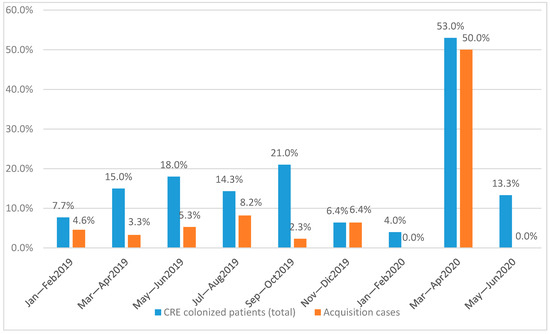 In the first two months (January and February) of 2019, 3.1% of cases were primary colonization cases and 4.6% CRE acquisition. Successively, in March–April 2019, the overall incidence was higher (15%), but the incidence rate of CRE acquisition cases was lower (3.3%). In May–June 2019, 5.3% of cases were CRE acquisition cases. In July–August 2019, CRE acquisition shown a slight increase in the incidence rate compared with the previous two months (8.2%). In September–October 2019, there was the highest incidence rate of CRE colonized patients, 21%, but the CRE acquisition was only 1, with the lowest incidence rate of 2.3%. In November–December 2019, 31 patients were admitted with 4 colonized CRE patients, of which 2 CRE were acquisition cases.