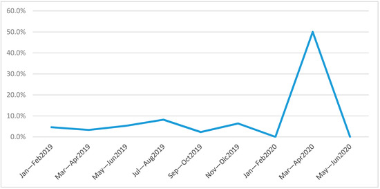 In May–June 2020, the ICU was COVID-19 free. During this period, 30 patients were admitted, of which 4 were colonized patients, all defined as primary cases. The analysis of the incidence of the acquired cases showed a decreasing trend from 50% to 0%.