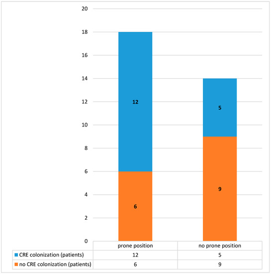 All the CRE isolated were Klebsiella pneumoniae KPC (Klebsiella Pneumoniae Carbapenemase). Out of the 32 ARDS COVID-19 patients, 18 were pronate and 14 were not. Of the 18 pronate patients, about 12 were colonized by CRE (1 primary colonization cases and 11 CRE acquisition cases). Out of the 14 not pronate patients, 5 were colonized by CRE and all cases were CRE acquisition cases. The data are reported in Figure 3.