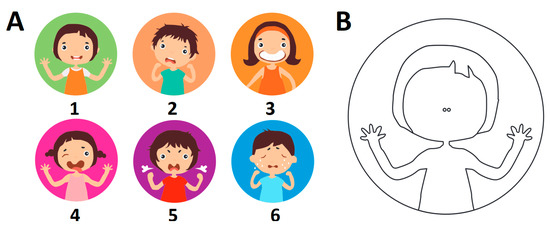 The emotional state of children was evaluated in the waiting room prior to dental procedures by a caregiver, dentist and by the child. The whole procedure took max. 15 min. Dentists and caregivers independently assessed the children’s emotional state using the faces mood scale (Figure 1). The scale was prepared by a graphic artist according to the facial muscle changes involved in a fearful expression and based on photographs of faces showing increased fear [31]. The evaluating individual selected one of the six drawn faces that suited the child’s emotional state. The drawings were numbered as follows: 1—calm; 2—uncertain; 3—reserved, closed and uncooperative; 4—avoiding; 5—loud; 6—crying. The pediatric patients, given the paper with a blank face (Figure 1), were asked to complete the drawing by adding the facial elements: eyes, nose and lips. Prior to this, all children were instructed that a drawing should express their own emotions before the dental appointment. The dentist then categorized the children’s drawings to the corresponding faces 1–6, mostly by matching eye and lip expressions. Such a graphical approach in the evaluation of the emotional state of children appears to be advantageous compared to the numerical scale assessment - it only requires simplified verbal instructions and is more accessible for children to understand than a translation of their inner state to a particular numerical score [32]. It has also been demonstrated that children and their caregivers tend to prefer the faces scale over other evaluation methods [33,34]. The numbers associated with each drawing were operationalized by transforming them into 1–6 Likert scales, where 1 and 6 indicated the lowest and highest level of anxiety, respectively.