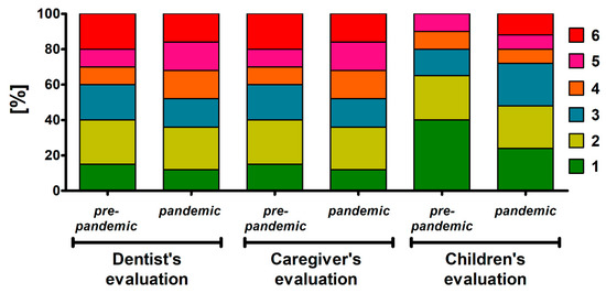 The emotional state of children in the pandemic group did not differ from that in the pre-pandemic group, either when assessed by the dentist [median (interquartile range, IQR): 3 (2–5) vs. 2 (1–4)], caregiver [3 (2–5) vs. 3 (2–5)], or the children themselves [3 (2–4) vs. 2 (1–3)] (p > 0.05 in all cases, Mann-Whitney U test). However, the percentage of children for whom the highest anxiety score of 6 in the pre-pandemic and pandemic groups was 20.0 and 12.0% (dentist’s evaluation), 20.0 and 16.0% (caregiver’s evaluation) and 10.0 and 24.0% (self-evaluation by children), respectively In turn, the lowest anxiety score of 1 in these groups was 30.0 and 16% (dentist’s evaluation), 15.0 and 12.0% (caregiver’s evaluation) and 40.0 and 24.0% (self-evaluation by children), respectively The summary of scores in each group given by dentists, caregivers and children is presented in Figure 2. The scores given by the dentist, caregivers, and self-reported by the children were all highly correlated in both studied groups of children (Table 2).