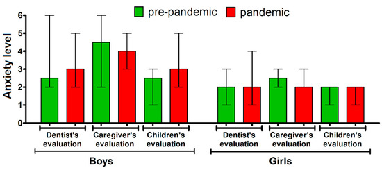 The emotional state of boys and girls before the dental appointment in the pre-pandemic (n = 20) and pandemic group (n = 25) as assessed by dentists, caregivers and children themselves. The bars represent median, the whiskers represent interquartile range.