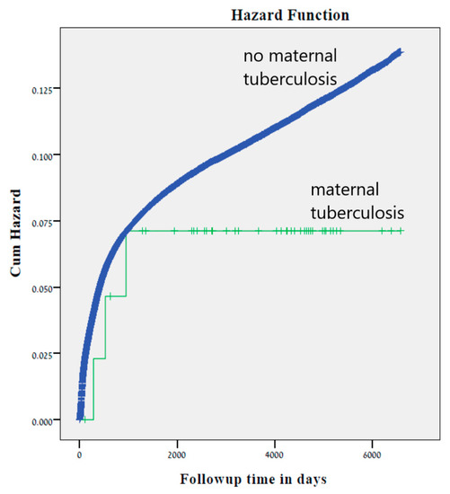 A population-based retrospective cohort study was conducted. The study investigated perinatal outcomes of mothers with tuberculosis and the long-term infectious morbidity of offspring of mothers with tuberculosis. The primary exposure was maternal tuberculosis diagnosed before or during the current pregnancy. Any patient with relevant clinical manifestations (cough >2 to 3 weeks’ duration, lymphadenopathy, fevers, night sweats, weight loss) and relevant epidemiologic factors (history of prior tuberculosis infection or disease, known or possible tuberculosis exposure, and/or past or present residence in or travel to an area where tuberculosis is endemic), and/or positive Tuberculin Mantoux test, was administered as one of the diagnostic tests of tuberculosis. The possible diagnostic tests included were isolating mycobacterium tuberculosis from bodily secretions (culture of sputum, bronchoalveolar lavage, or pleural fluid), or tissue (pleural biopsy or lung biopsy) and sputum acid-fast bacilli smear, and nucleic acid amplification testing was also considered diagnostic for tuberculosis [22,23]. Offspring of mothers without tuberculosis comprised the comparison (unexposed) group.
