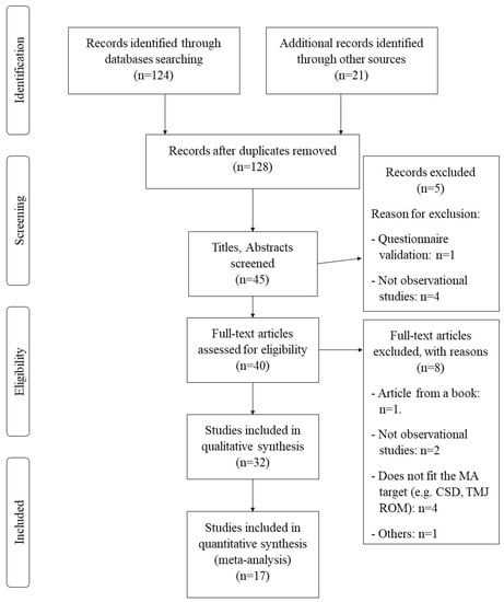 We included studies in the systematic review and meta-analysis if they met the following criteria: (1) cross-sectional design, either cohort or case-control studies; (2) adult patients diagnosed with TMD (mixed, myogenic, or arthrogenous); (3) reported somatosensory, motor, and disability variables of the cervical spine. Studies were excluded if they included patients with primary headaches or non-specific chronic neck pain.