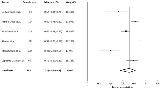 The association between neck disability and jaw disability in patients with TMD was assessed in six studies [36,51,53,57,58,62]. All of the studies employed the neck disability index for cervical disability. Two of the studies used the jaw function scale for TMJ disability [36,62], and the rest of the studies employed the craniofacial pain and disability inventory [51,53,57,58]. All studies showed significant associations between neck disability and jaw disability in patients with TMD [36,51,53,57,58,62]. The strongest association was found by Silveira et al. [62] (r = 0.915), and the lowest association was found by Greghi et al. [53] (r = 0.40). The meta-analysis for the association between neck disability and jaw disability in patients with TMD showed statistically significant correlations with a moderate clinical effect (six studies [36,51,53,57,58,62], 548 patients; SMD, 0.72; 95% CI 0.56–0.82) and heterogeneity (Q value, 42.07; p < 0.001; I2, 88%). The shape of the funnel plot appeared to be symmetrical in the dominant model, as judged by visual examining the intensity of the pain (Figure 2). The influence of each individual study was assessed with a sensitivity exclusion analysis. We obtained statistically strong results because the analysis suggested that no individual study significantly affected the pooled SMD. The similarity found among the pooled estimates suggested that there was no single study influencing the results of the meta-analysis (Annexes; Figure A1).