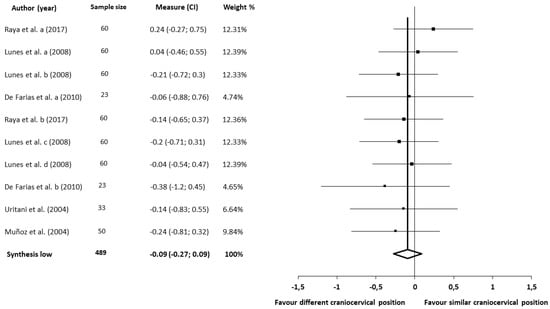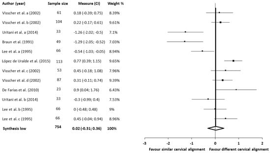 Craniocervical position was addressed by the following five outcome measures through five studies [48,55,59,61,65]: C0–C1 distance [48,55,61], craniocervical angle [55,61], high cervical angle [48], cranial rotation angle [65], and skull base/odontoid angle [59]. None of the studies showed significant differences.