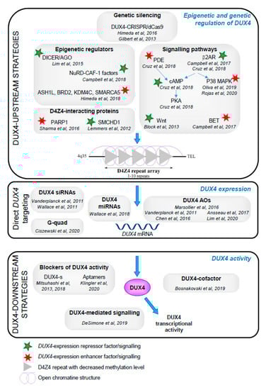 Graphical summary of therapeutic strategies targeting DUX4 in facioscapulohumeral muscular dystrophy (FSHD). Diagram summarizing the different therapeutic strategies discussed in this review. Targeting DUX4-mediated toxicity in skeletal muscle was achieved by (1) genetically or epigenetically regulating DUX4 expression, (2) directly targeting DUX4 transcript by RNAi or AOs-based approaches, and (3) inhibiting DUX4 activity. Numerous studies have tried to identify proteins and signaling pathways involved in regulating DUX4 expression (top section of the diagram). These factors had either positive or negative effects on gene expression. The green star represents DUX4-repressors while the red star corresponds to enhancers of DUX4 expression. The characteristic chromatin relaxation is illustrated in light purple and the D4Z4 hypomethylation status is depicted by the light grey triangles.