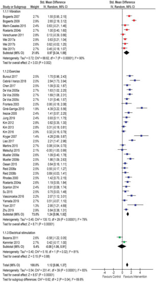 Basic analysis compared the effects of the RT, EMS, and WBV interventions. Further subgroup analyses were conducted where possible (depending on the number of studies reporting a given outcome) based on several independent variables, related to the characteristics of the interventions (e.g., weekly number of sessions). Some outcomes did not appear in EMS and WBV studies and were thereby only analyzed in view of RT studies. Statistical heterogeneity among studies was determined by calculating the I2 statistics. According to Cochrane guidelines, the I2 statistics of 0% to 40% might not be important, 30% to 60% may represent moderate heterogeneity, 50% to 90% may represent substantial heterogeneity, and 75% to 100% indicates considerable heterogeneity [35]. The threshold for statistical significance was set at p ≤ 0.05 for the main effect size and the subgroup difference tests.