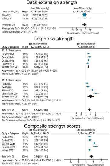 Leg press strength was reported in 5 RT studies (8 interventional groups) [46,60,61,68,69]. There was a statistically significant increase in intervention groups across studies (SMD = 1.45 (0.85–2.06); p < 0.001; I2 = 83%) (Figure 3). Interventions performed 3 times per week tended to have a larger effect (SMD = 1.98 (0.50–3.45)) than interventions performed 2 times per week (SMD = 1.12 (0.78–1.47)), but the subgroup difference was not statistically significant (p = 0.27 for subgroup differences). Two RT studies reported back extensor strength [45,70] and showed a statistically significant increase (MD = 7.97 kg (3.07–12.88 kg); p < 0.001; I2 = 0.0%) (Figure 3). Three RT studies [71,72,73] reported a composite score for strength (i.e., sum of several strength tasks). There was a statistically significant improvement in intervention groups (SMD = 3.55 (2.28–4.83); p < 0.001; I2 = 90%) (Figure 3). Grip strength was reported in 19 RT studies [44,45,49,52,53,55,56,59,61,65,67,69,70,74,75,76,77,78,79]. There was a mean increase of 1.48 kg (0.26–2–23 kg; p < 0.001) across studies with pre-post mean differences ranging from −1.00 to 5.70 kg.