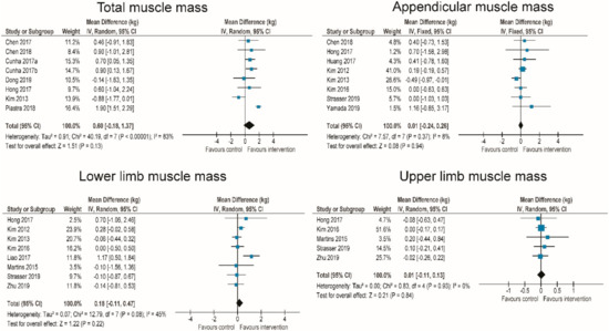 Muscle mass was reported in 7 RT studies (8 intervention groups) [45,52,70,71,74,78,80]. Compared to control groups, there was not a statistically significant increase in muscles mass in intervention groups across studies (MD = 0.60 kg (−0.18–1.37 kg); p = 0.13; I2 = 83%) (Figure 4). There were no differences between interventions performed 2 times a week (MD = 0.60 kg (−1.01–2.22 kg)) and 3 times a week (MD = 0.68 kg (0.23–1.14 kg)) (p = 0.93 for subgroup differences). Appendicular muscle mass was reported in 7 RT studies [51,52,53,65,70,80,81,82]. The pooled effect showed no change after RT interventions compared to control groups (MD = 0.01 kg (−0.26–0.28 kg); p = 0.92; I2 = 8%) (Figure 4). Lower-limb muscle mass was reported in 8 RT studies [51,52,53,55,56,67,80,82], with an overall small and statistically non-significant increase (MD = 0.18 kg (−0.11—0.47 kg); p = 0.22; I2 = 45%) (Figure 4). No statistically significant differences were shown between interventions performed 3 times per week (MD = 0.55 kg (−0.44–1.55 kg)) compared to interventions performed 2 times per week (MD = 0.10 kg (−0.10–0.31 kg)) (p = 0.39 for subgroup differences). Upper limb muscle mass was reported in 5 RT studies [53,56,67,80,82], and the pooled effect was negligible (MD = 0.01 kg (−0.11–0.13 kg); p = 0.84; I2 = 0%) (Figure 4).