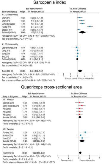 Nine RT studies [44,50,67,70,74,77,78,82] and one EMS study [86] also reported the sarcopenia index (sometimes termed skeletal muscle index) (Figure 5). Mainly (7 studies), the index was computed as the ratio of appendicular skeletal muscle mass and the square body height. However, since two studies did not report the exact calculation of the index, we opted for SMD in order analyses to be conservative. There was a moderate, but statistically non-significant improvement across all studies (SMD = 0.65 (−0.02–1.32); p = 0.06; I2 = 90%). Subgroup analyses favored RT interventions, performed 2 times weekly (p = 0.008); this is being heavily influenced by one RT study that showed substantial improvement (SMD = 3.44). Most of the studies showed very small negative or very small positive effects, while the pooled effect was heavily influenced by the aforementioned study. Furthermore, 3 WBV studies [42,87,88] (5 intervention groups) and 3 RT studies [47,62,66] reported the quadriceps muscle (or individual heads of quadriceps muscle) cross-sectional area. In order to obtain a sufficient number of studies for meaningful comparison, these results were compared together and expressed as SMD. Overall, there was a statistically significant effect of interventions (SMD = 0.29 (0.03–0.55); p = 0.03; I2 = 0%) (Figure 5). Subgroup differences showed no differences between RT (SMD = 0.61 (0.04–1.18)) and WBV (SMD = 0.20 (−0.09–0.49) (p = 0.21 for subgroup differences). For the RT studies (all reported the cross-sectional area for the full quadriceps muscle), the MD was 1.80 (0.51–3.09) cm2. One RT study [57] reported thigh circumference, with no effect of the intervention (MD = −0.10 cm (−2.55–2.35 cm); p = 0.94; I2 not applicable).