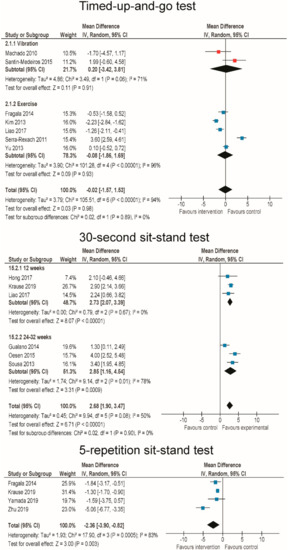 The results on functional performance are summarized in Figure 6. The timed up-and-go test was performed in 2 WBV [87,88] and 6 RT studies [52,55,69,75,90]. Overall, there were no differences between intervention and control groups across all studies (MD = −0.12 s (−1.36–1.12 s); p = 0.85; I2 = 93%). There were also no differences between the WBV and RT (MD = 0.20 and −0.08 s, respectively; p = 0.89 for subgroup differences). The 30-s sit-stand test was performed in 6 RT studies [55,59,68,76,80,85], with an overall improvement of 2.68 repetitions (1.90–3.47 repetitions, p < 0.001; I2 = 0.50%). There was no difference between interventions performed 2 times per week (MD = 2.85 (1.16–4.54 repetitions)) and 3 times per week (MD = 2.73 (2.07–3.39 repetitions)) (p = 0.90 for subgroup differences). The 5-repetition sit-stand test was recorded in 4 RT studies [65,67,75,76], and there was a significant improvement (i.e., decreased time to complete the test) across all studies (MD = −2.36 s (−3.9–−0.82 s); p = 0.003; I2 = 83%).