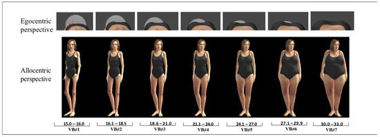 Conversely, VR body continuum tasks share similarities with the traditional paper-based FRS. Typically, the user immersed in VR is invited to rate or select from a line-up of several virtual bodies. This method allows the user to compare various virtual bodies, adding an element of social comparison that is often important in BIDs [46]. Using a VR body continuum task, Fisher et al. [29] compared ratings of virtual bodies to ratings of classical paper-based FRS by 31 anorexic adolescents. Ten virtual female bodies were displayed and evenly spaced in a circle around the user immersed in VR. The participant could observe each virtual body, numbered from 1 to 10, and illustrating a progressive increase in body mass index (BMI) from 10 to 30 kg/m2. Participants were asked to indicate which virtual bodies corresponded to their perceived and ideal body size. Time spent looking at each virtual body was also measured. The authors found no significant difference in average score ratings obtained through the paper-based and the VR-based FRS. Furthermore, the correlations between body dissatisfaction (calculated using the VR-based FRS) and measures of BIDs were significant (drive for thinness (Eating Disorder Inventory 2; EDI-2), 0.50; body dissatisfaction (EDI-2), 0.47; body dissatisfaction (Body Shape Questionnaire; BSQ), 0.41) but moderate. Although correlations between the VR-based body ratings and the paper-based FRS would have contributed to understanding the convergent validity of the immersive method and provided more nuanced interpretation than a lack of significant difference in average scores, they were not reported. Results from Fisher et al. [29] were a significant first step in validating the virtual body continuum task in the assessment of BIDs. However, in their VR-based FRS the authors developed and used virtual bodies presented only in an allocentric perspective. Therefore, they did not explore the potential uses of and differences between the allocentric and egocentric perspectives.