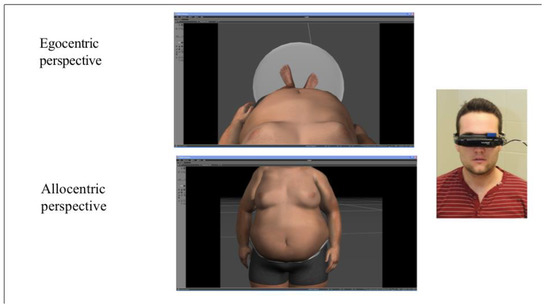 A growing number of studies have recently explored the potential of VR technologies by presenting scenarios through allocentric perspectives (e.g., as if immersed users are looking at their image in a mirror) [42,43]. However, VR also makes it possible for participants to look at themselves from an egocentric perspective (e.g., as if they are inside the virtual bodies). In addition to the possibility of exploring allocentric and egocentric representations of the body, VR technology allows for simulating real-life situations related to body image concerns (e.g., being looked at by other people). It also provides confidential, flexible, and controlled environments where participants can be exposed to emotionally-challenging situations. In VR, people are more than merely rating figure drawings of various body sizes. Immersive technologies track people’s head and body movements, allowing the user to navigate around virtual bodies, move closer or farther from body parts, and assess realistic 3D representations of the human body perceived from multiple angles.
