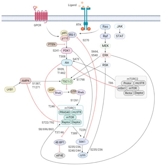- Chiang, G.G.; Abraham, R.T. Phosphorylation of mammalian target of rapamycin (mTOR) at Ser-2448 is mediated by p70S6 kinase. J. Biol. Chem. 2005, 280, 25485–25490. [Google Scholar] [CrossRef] [PubMed]