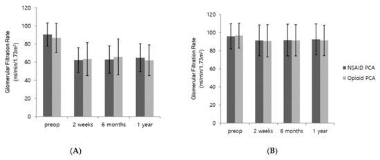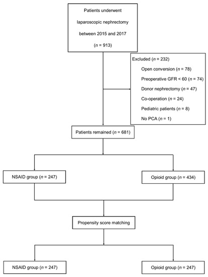 In our institution, we have used both NSAID and opioids PCA for many years in patients undergoing laparoscopic nephrectomy, in accordance with the preferences of anesthesiologists and surgeons. In this retrospective analysis, we compared the effects of NSAID PCA on renal function with those of opioid PCA. The primary outcome of our study was the GFR after laparoscopic nephrectomy; secondary outcomes included renal function test results, rates of postoperative complication, incidences of acute kidney injury (AKI), pain scores, and length of hospital stay.