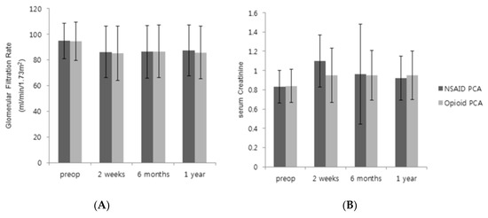 Pre- and postoperative glomerular filtration rate (GFR) and serum creatinine. (A) GFR, (B) serum creatinine. Comparison of GFR and serum creatinine between NSAID PCA group and opioid PCA group. There were no significant differences. Results are expressed as mean ± SD.