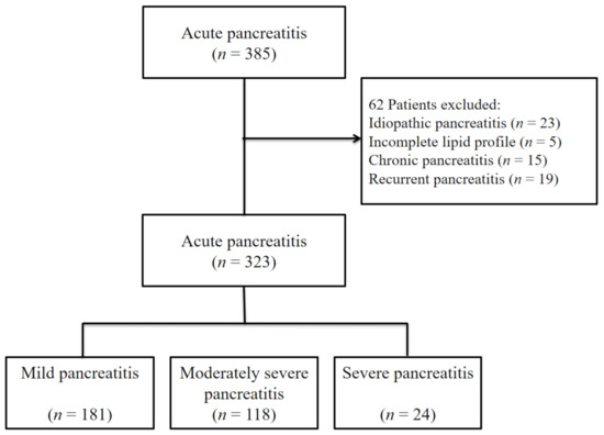 The diagnosis of AP was based on the presence of two of the following three criteria: (1) upper abdominal pain, (2) serum amylase and/or lipase ≥3 times the upper normal limit, and (3) characteristic imaging on a radiological study [17]. The etiology of AP included gallstones, alcohol consumption, and high TG. The exclusion criteria were the following: (1) age < 18 years old, (2) idiopathic pancreatitis, (3) patients with incomplete lipid profile data, (4) chronic pancreatitis, and (5) recurrent pancreatitis.