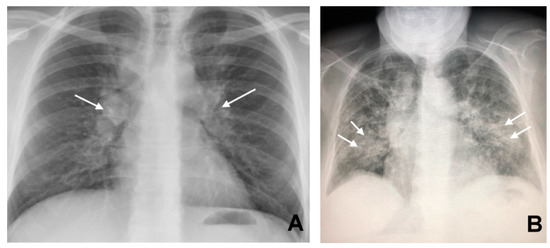 Bilateral hilar lymphadenopathy ((A) arrows) and bilateral parenchymal infiltrations with a tendency to confluence ((B) arrows).