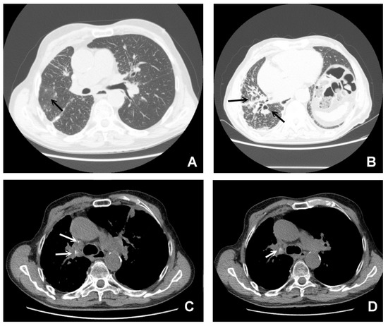 CT findings in pulmonary sarcoidosis. Panel (A) large nodule surrounded by numerous tiny satellite nodules (the “Galaxy sign”, arrow). Panel (B) shows multiple traction bronchiectasis with architectural distortion of the parenchyma (black arrows). Panel (C,D) (white arrows) shows the presence of calcifications of enlarged lymph nodes.