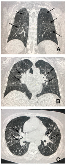 In the case of a patient’s presentation in the full fibrotic phase, the diagnosis of sarcoidosis can be suggested by the characteristic centrifugal and dorsolateral distribution of fibrotic lesions with a prevalence in the upper lung fields. In advanced stages, the characteristics of fibrosis can include linear opacities, pulmonary arch distortion, traction bronchiectasis and honeycombing located mainly in the upper lung fields (Figure 6) [23].