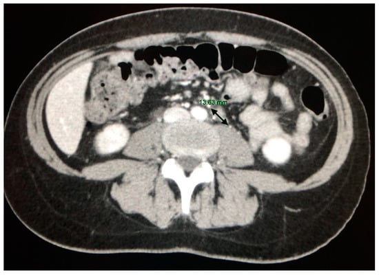 Lymph nodes enlargement with a maximum size of 13.63 mm (arrow) in the para-aortic site.
