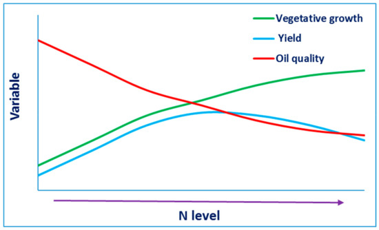 N is a major essential plant nutrient and the most commonly applied mineral in fertilization programs of horticultural crops [34]. Until a few years ago, there was a debate regarding the significance of annual application of N for olive productivity as part of olive orchard management, including claims that N is generally supplied in excess [35]. This argument was supported mostly by evidence from extensive, non-irrigated orchards [36,37], where olive tree performance responded positively to N fertilization only when trees were grown under harsh N-supply conditions [38,39]. Recent experiments, carried out on intensively cultivated, irrigated olive orchards, revealed a strong positive response of tree performance to N fertilization [14,40,41,42]. Adequate N fertilization resulted in more vigorous vegetative growth, producing shoots with potential for carrying yields in the subsequent season [14]. In extensive, non-irrigated olive orchards, both soil and foliar N application is common [6]. This practice offers little opportunity to control soil N dynamics. In intensive, irrigated orchards, fertigation is the common practice, allowing maintenance of high levels of available soil N. In both cultivation systems, over-fertilization with N might lead to yield reduction, by downregulating physiological processes related to flower quality [43] and fruit set [14], or due to some not yet fully understood toxic effect [44,45]. Furthermore, over-fertilization with N adversely affects oil quality, especially via elevated free fatty acid content and reduced polyphenol levels in the oil [15,46]. Reduced polyphenol levels in the fruit affects fruit health by reducing their resistance to fungal infestation, which further impairs oil quality [47]. Figure 1 provides a schematic illustration of the composite response of olive trees to N fertilization.