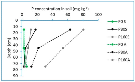 Soil P (Olsen) concentrations in autumn (A) and spring (S) in a fertilization field experiment in olives. P0, P80, and P160 represent 0, 80, and 160 kg P2O5 ha−1 year−1, respectively.