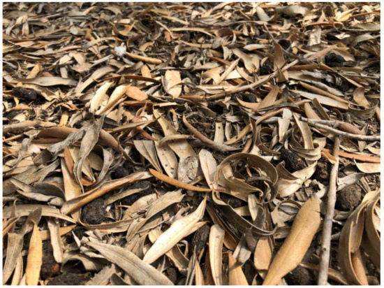Some nutrient recycling occurs naturally. Dropped leaves and fruit form a soil layer with higher organic matter content below the trees (Figure 6). The life span of an olive leaf is approximately 2 years [99]. Toward the end of this period, leaf-aging processes begin, including nutrient translocation to younger leaves [100] and subsequently, leaf drop. The dropped leaves are a potential source of nutrients as they eventually decompose. However, it is extremely difficult to assess the quantitative nutritional contribution of these leaves to the orchard as decomposition rates depend on environmental factors and management practices.