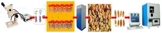 The empirical studies were conducted in the specialist laboratory of the Department of Entomology of the Plant Protection Institute—the National Research Institute in Poznan (IOR–PIB Poznan). For the experiments, an appropriate number of beetles were prepared via special breeding. Then, using a stereoscopic microscope, the males were separated from the females on the basis of the morphological differences in the structure of the snout and abdomen. The study used 50 polypropylene containers (height 65 mm, diameter 38 mm, capacity 60 mL), which had a suitable construction enabling air inlet but prevented the tested pests from getting out of the container. Four hundred randomly selected caryopses were put into each container, and then 20 pairs of grain weevil beetles were placed inside (20 males and 20 females). The period of time when the beetles were kept in particular containers was 5, 10, 15, and 20 days. During that time, all the grain weevil individuals were feeding, copulating, and laying eggs, which in turn developed into larvae. The containers were placed in an incubator in order to make it possible to take measurements and obtain empirical data at the same time. After the incubation period of the grain weevils feeding on the caryopses, the samples were cleared of the beetles and other pollutants. Four hundred caryopses were randomly selected from each sample and placed in a SKCS 4100 (Single-Kernel Characterization System) Perten Instruments, Sweden appliance. The scheme of obtaining empirical data is presented in Figure 2: