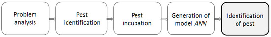 The values of all the aforementioned physical properties were obtained from 400 caryopses randomly selected from each sample. The tests were repeated in the following time intervals: 0 day (control—a combination without pests), and 5, 10, 15, and 20 days from the moment the pest came into contact with the grain. The data collected and classified in this way was converted to a form of training set, which was necessary to generate the ANN. The set of the neural models was created in the Statistica v. 10 program with a simulator implemented in the “Neural Networks” module [20,24,25,26,27].