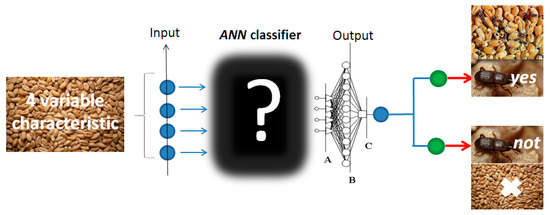 An effective identification of the effects of grain weevil feeding on stored grain entailed the designing, manufacturing, and verification of the new, original classification model [7,8,9,10,11]. The commonly recognized separation properties, such as those represented by artificial neural networks, imply the legitimacy of using them in the process of identifying grain damage caused by grain weevil [12]. It ought to be emphasized that the source literature provides no examples of any effective use of neural modeling in the process of identifying internal macro-damage to wheat caryopsis caused by pests feeding on them. Moreover, there is no scientific knowledge concerning the determination of the type and level of significance of the representative properties of the infected wheat grain, which would enable the identification of the negative effects of this pest [13,14,15].