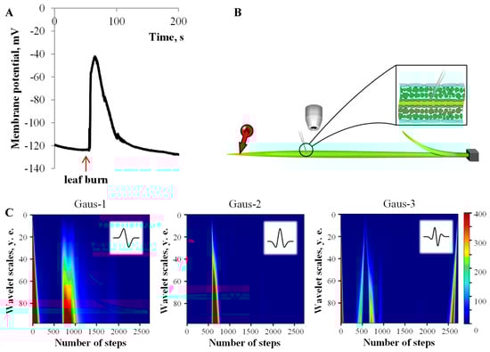 The typical intracellular record of the variation potential induced by burn of the wheat leaf tip and registered from the wheat cell by the microelectrode technique (A), a scheme of the experiment (B), and scalograms of the signal record wavelet transform by means of first- to third-order Gaussian basses (C). One step equals 0.1 s. The reaction started at 56 s, expressed as a local maximum on a scalogram.