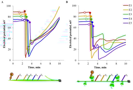 Extracellular registration of electrical activity is the only option for multichannel recording in plants, allowing for the estimation of the propagation parameters of electrical signals in plants. It is also the most suitable approach for simultaneous registration of electrical activity and parameters of plant functional activity [,,,,]. The typical multichannel records of heat-induced electrical signals in wheat and pea are presented in Figure 3A,B, respectively. Extracellularly registered signals have a reversed polarity. The essential difference of the extracellular recordings from the intracellular is their “blurriness”: a less pronounced peak of depolarization, a lack of a clear starting point for depolarization. The “blur” is resulted from the superposition of electrical signals from many cells when macroelectrodes are used. The most blurred are the signals recorded at long distance from the local damage area that is caused by VP decrement as it propagates []. These features make it difficult to determine the reaction start time.
