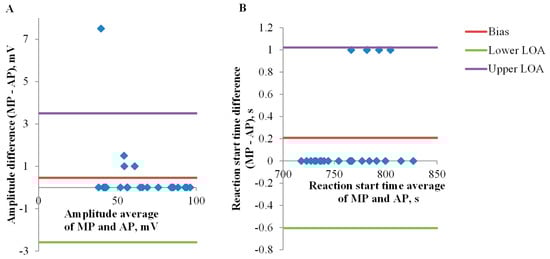 The Bland–Altman method was used to evaluate the accuracy of the automatic processing. The principle of the method is based on determining the range, within which 95% of the differences between the two techniques, in this case between manual and automatic processing, are included. In addition, the mean deviation between the two techniques was calculated. The reaction start time at manual processing was determined as the beginning of the rapid depolarization in the signal recording, namely. The amplitude of the reaction was determined as the difference between the values at the reaction start time and its peak value [,].