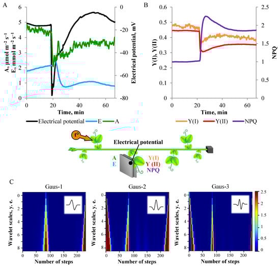 The electrical signal propagation in plants causes a change in the activity of a number of physiological processes, among which researchers focus on photosynthesis [,,,,]. We have studied a number of parameters of the photosynthetic response, including quantum yields of photosystems I and II (Y (I) and Y (II)), non-photochemical fluorescence quenching (NPQ), rate of CO2 assimilation (A), and level of transpiration (E). The typical records of the photosynthesis parameters changes induced by variation potential are shown in Figure 5A,B. VP propagation lead to a decrease in photosynthesis activity, which is manifested in reduced assimilation and transpiration, lower quantum yields of photosystems I and II, and increased non-photochemical quenching. This rapid decrease in the activity of photosynthesis is followed by a recovery which is very slow compared to the duration of the electrical signal. It should be noted that the determined parameters of the photosynthesis response in pea seedlings induced by variation potential are in good agreement with the data obtained by other research groups with various plant objects, including mimosa [], poplar [], corn [], etc. In the mentioned works, the temporal dynamics of the photosynthetic response was similar to each other and to the one registered in our experiments: the rate of CO2 assimilation decreased by 30–100%, and Y (II) decreased from 0.6 to 0.2. The choice of wavelet type for transformation was based on Y (II) dynamics, due to the importance of this parameter for evaluation the activity of the photosynthesis apparatus and the possibility of its measuring without dark adaptation in field conditions. As in the previous case with the electrical signal, the first- to third-order derivatives of the Gaussian function were considered (Figure 5C). The CWT extremes were most pronounced after transformation of YII dynamics with Gauss-1, which corresponds to a one-phase change of the parameters of photosynthetic activity. Such an analysis was also performed for the other types of the functional response, demonstrating optimal use of Gauss-1 compared to Gauss-2 and Gauss-3 (data not shown). The range of optimal scale values was established using Bland–Altman analysis for every type of the functional response.